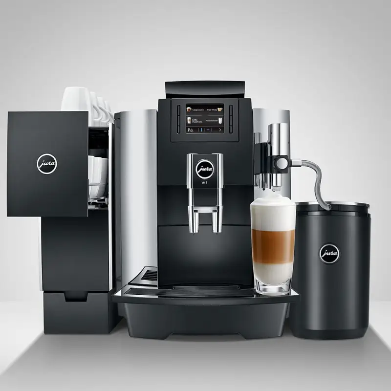 The successful automatic machine for the office is now even more perfect. The WE8 now prepares a total of 16 different specialities at the touch of a button. It now offers macchiato, espresso doppio, special coffee and hot water for green tea at the touch of a button.